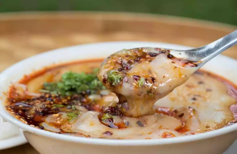Thin bean flour is typically made by slurrying pea flour. The slurry is made into two types: a clear slurry and a thick slurry. A Bite of China, Season 4, discusses how to prepare thin bean flour. After cooking, thin bean flour should be consumed immediately. It can be mixed with rice noodles or rolled with rice noodles, or by slicing pieces of simmered rice balls or fried dough sticks into the thin bean flour. When preparing simmered rice balls (or fried dough sticks), seasonings are added first, while those mixed with rice noodles or rolled with rice noodles are added last. The seasonings include: bright red chili oil, emerald green cilantro, light yellow ginger juice, brine, MSG, soy sauce, and sesame oil.