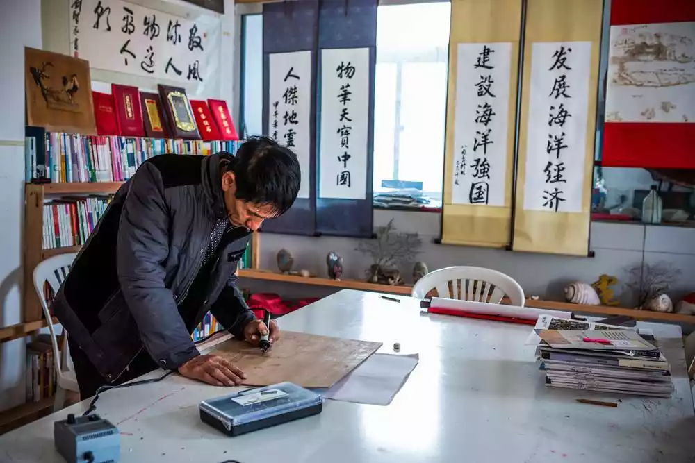 In iron painting, the drawing paper is plywood, and the brush is an electric soldering pen. Iron serves as the brush, and fire as the color. High temperatures create darker lines, while low temperatures create lighter ones. This style deviates from the freehand style of ink painting, teetering on the edge of realistic form. Thanks to Jiang Yuguo's innovation, Xiazhi's iron paintings incorporate traditional Chinese painting pigments, resulting in fade-resistant colors and a unique Xiazhi style.
