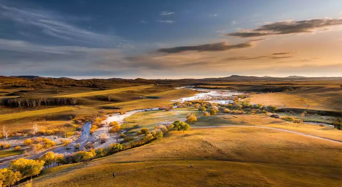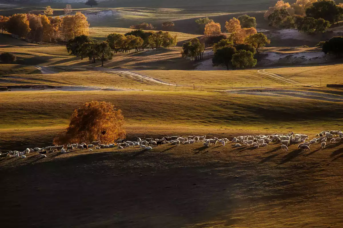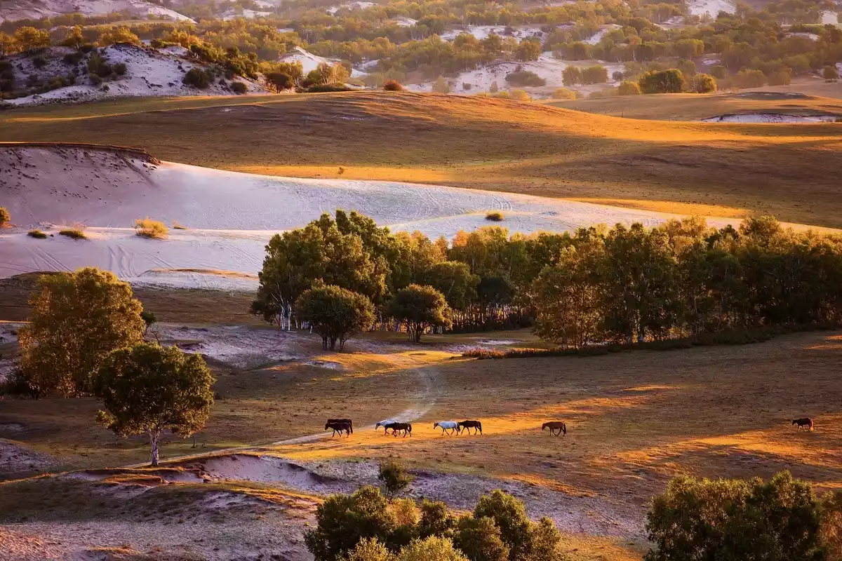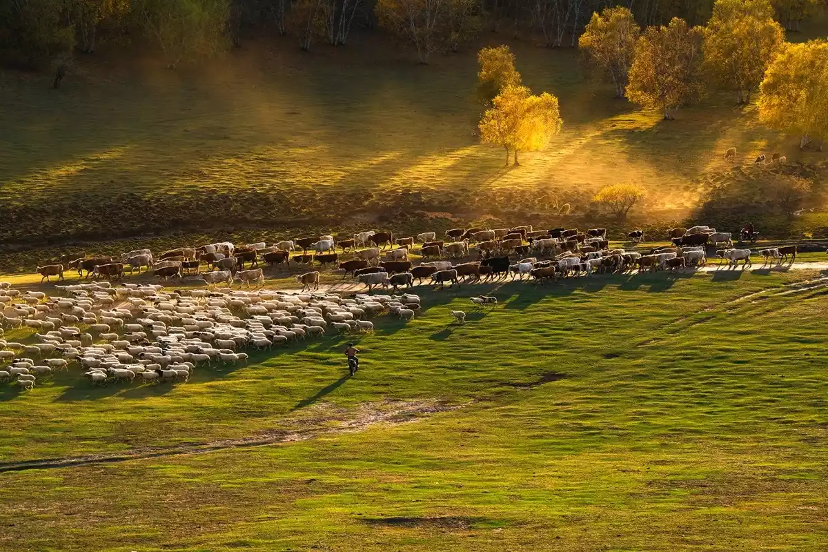 Bashang Nanjing is located in the core area of Ulanbutong at the southwestern end of Keshiketeng Banner, between Hulunori Village and Toufenggou. The scattered number of trees embellishes the vast grassland. The low houses in the depths echo the scenery. Cattle and sheep graze leisurely under the setting sun.