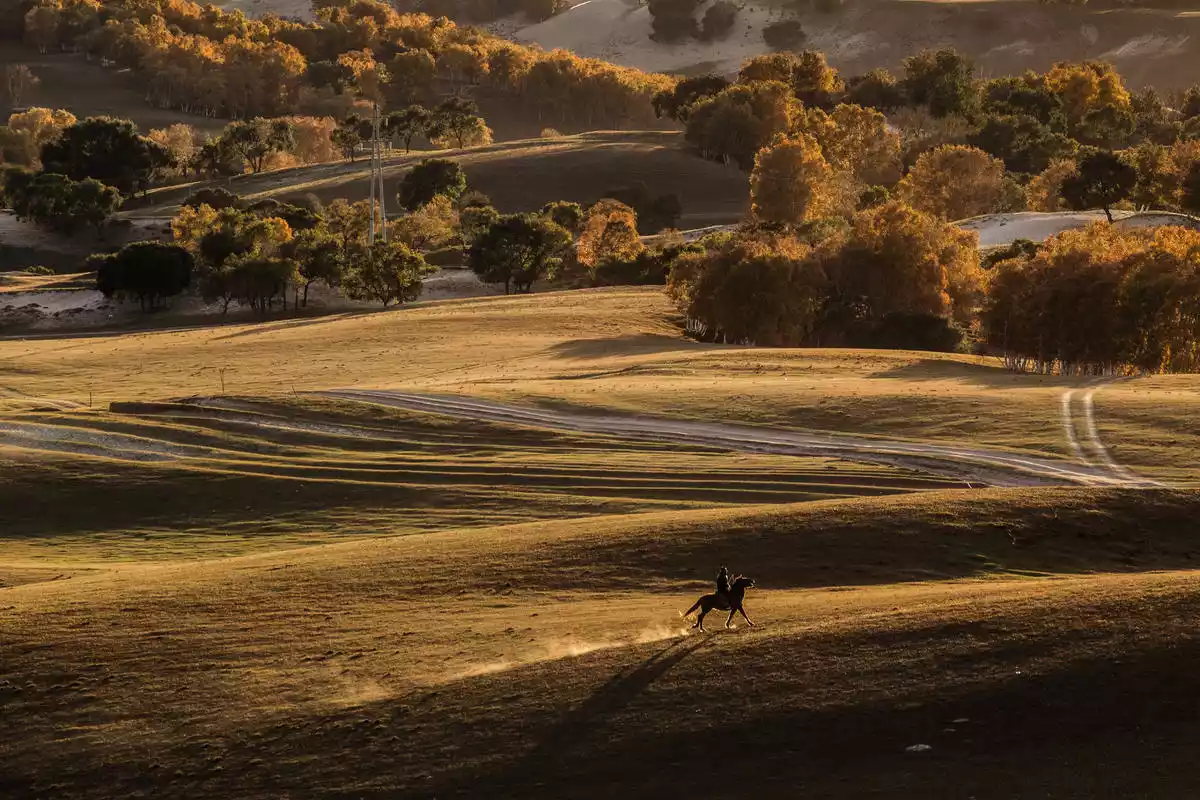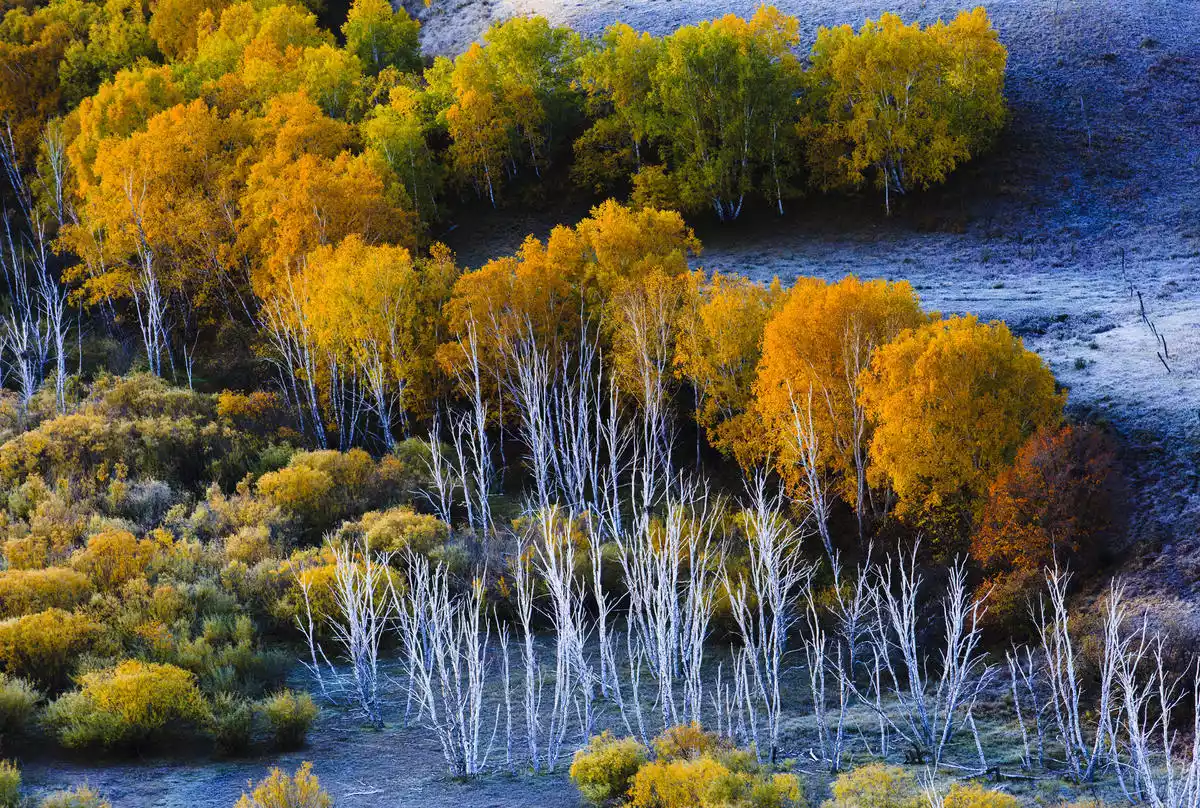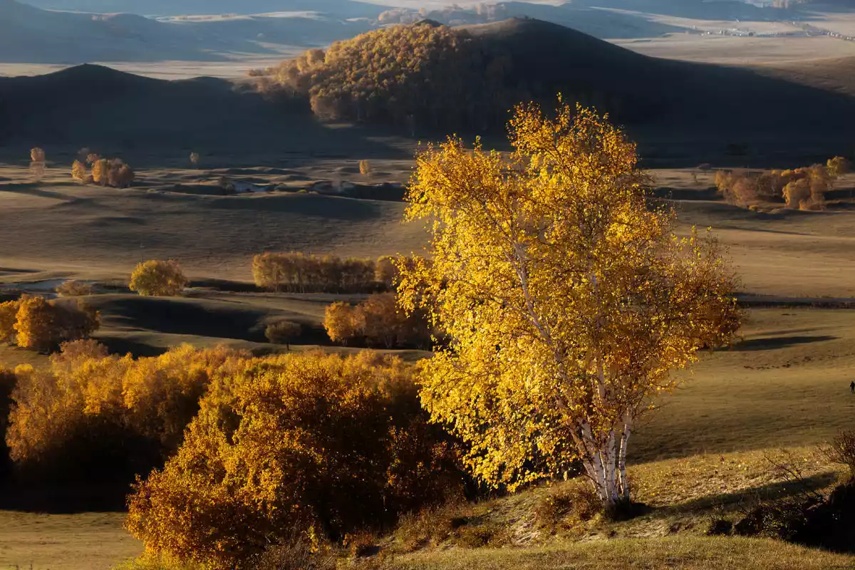 The birch forests here are perfect for portrait photography in autumn. The golden autumn grasslands complement the martial arts-themed portraits, enriching grassland photography themes. Essential lenses for portraits: 85mm, 50mm, with a wide aperture to blur the background and highlight the subject. Shooting is best after 4 p.m., when the light softens. Use various props to capture the model's emotions.