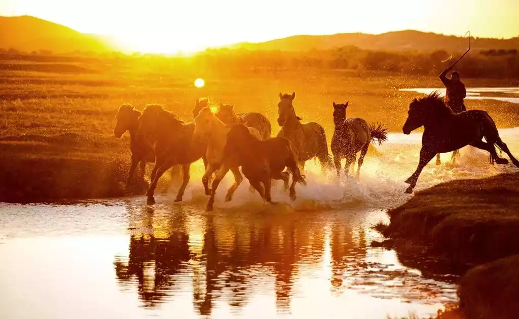 The shutter speed should be above 400. If you are unsure, you can use TV mode. You can increase the sensitivity appropriately but not too high. The aperture should be around 5.6. When there is a sunset, shoot both with the light and the backlight. The effect is very good. Many people ask if it is still possible to take pictures of horses stepping on water in the rain. The fact is that horses stepping on water in the rain can also be very beautiful. In the case of strong backlight, you can use local metering or spot metering with a smaller metering range.