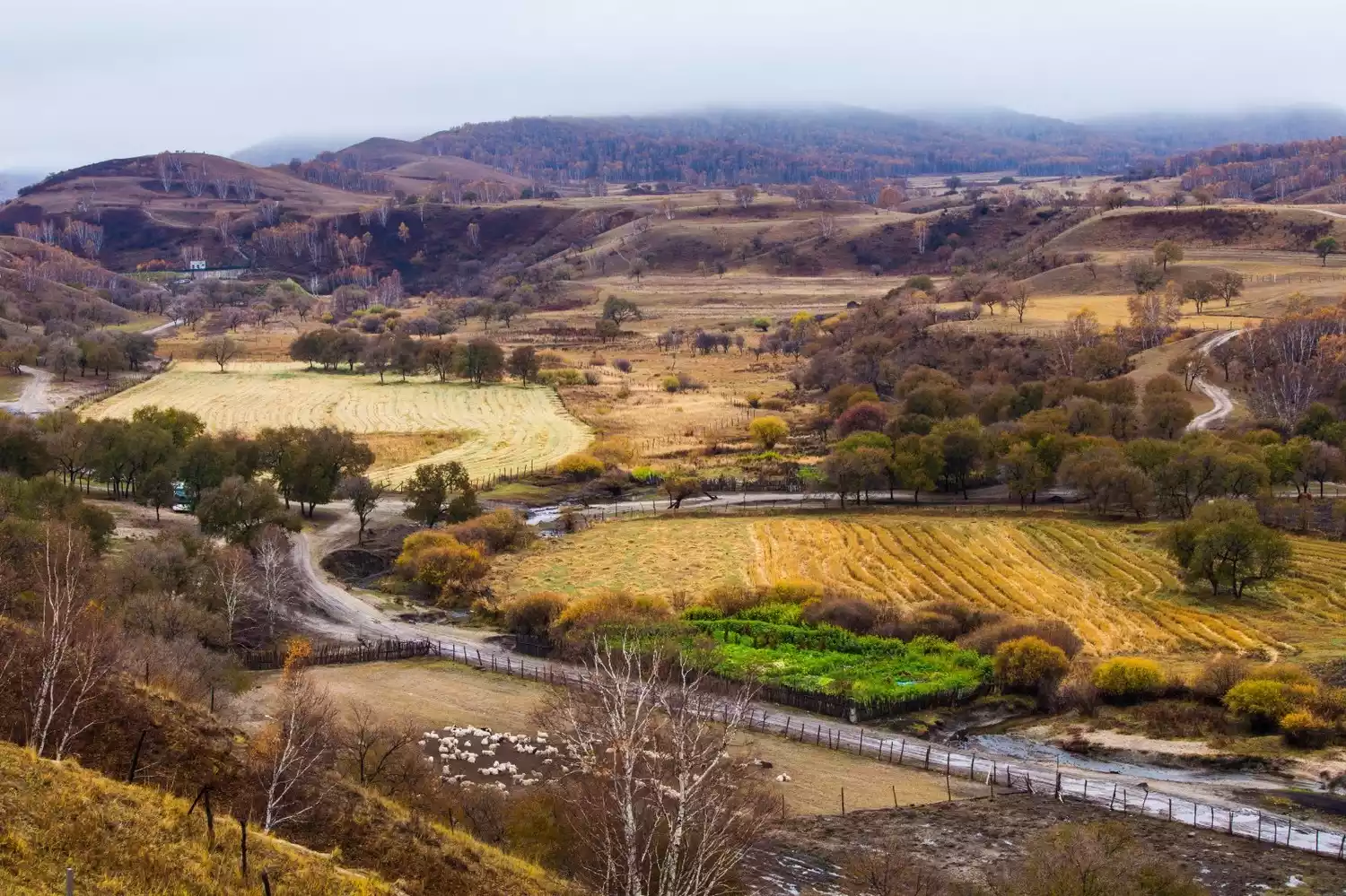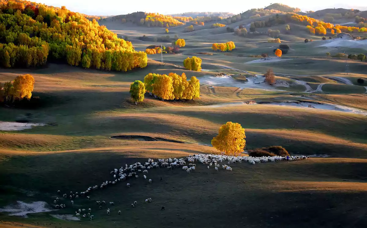 There are many kinds of trees on Wucai Mountain. After the frost in autumn, the leaves of different tree species turn into different colors, so it is called Wucai Mountain. It is colorful and is a must-see attraction for autumn photography in Ulan Butong. Looking down from the observation deck, there is also a European-style area dotted with herds of cattle, sheep and horses.
