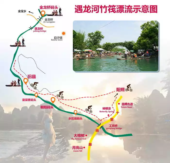 For a full day trip from Jinlong Bridge Pier to Wanjing Pier, we recommend cycling the first half, passing Fuli Bridge, a prime photo spot for capturing the idyllic scenery. Then, you can choose to raft from Jima/Shui'erdi Pier to Wanjing Pier. Photos are allowed during the rafting process, but these are subject to a separate fee. Some raftsmen may ask for tips, so this is a discretionary decision.