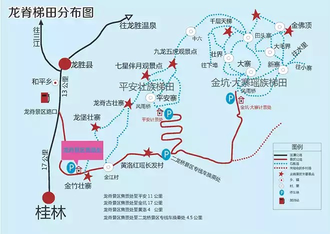 Transportation: Direct buses depart from Guilin or Yangshuo to the entrance of the Longji Rice Terraces scenic area or Dazhai. The journey from Guilin (West/North Bus Station) to Longji Dazhai takes approximately 2.5 hours and costs 65 yuan; the journey from Yangshuo to Longji Dazhai takes approximately 3.5 hours and costs 70 yuan. The journey from the entrance of Longji Scenic Area to Ping'an/Jinkeng takes approximately 1 hour and costs 40 yuan per person for a scenic shuttle bus. (Drivers with fewer than 9 seats are permitted into the scenic area; otherwise, a transfer will be required.)