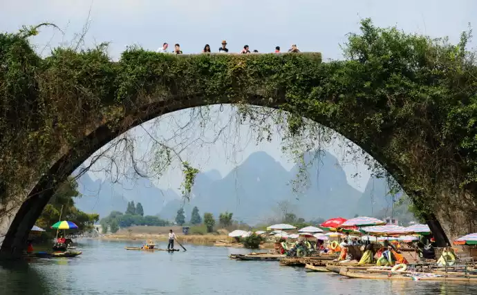 The 40-kilometer-long Yulong River, nicknamed "Guilin's Little Li River," boasts crystal-clear water year-round, and the idyllic scenery along its banks is truly breathtaking. Bamboo rafting docks are located near iconic landmarks like Gongnong Bridge, Yulong Bridge, and Jinlong Bridge. Raftsmen provide support throughout the journey, and the rafting hours are 7:30 AM to 5:30 PM. For example, from Shuei'erdi Wharf to Gongnong Bridge, you can choose between two-person and six- to eight-person rafts, but the scenic area doesn't offer shared rafts, so be sure to find a companion.