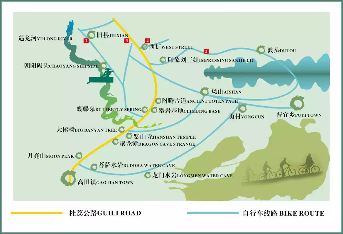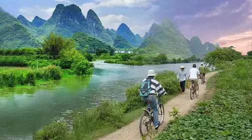 The best way to explore Yangshuo is by bike. The Ten-Mile Gallery area currently only allows access by local cars with permits, scenic area buses, bicycles, or electric scooters. The absence of large vehicles on the roads makes cycling safer and provides a more enjoyable experience.