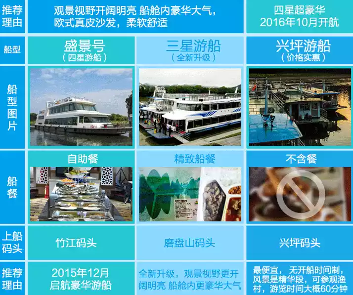 The four-star foreign guest cruise and the three-star cruise depart from Guilin's Zhujiang Wharf and Mopanshan Wharf to Yangshuo's Longtoushan Wharf, lasting approximately 4-4.5 hours, eliminating the hassle of traveling by boat or bus. The cruise has two decks, with the third deck being a deck, making it convenient for the elderly and children. Lunch is served near Jiuma Painting Mountain, so guests can enjoy a relaxing meal before enjoying the scenery on deck. The cruise ship provides announcements and explanations of scenic spots.