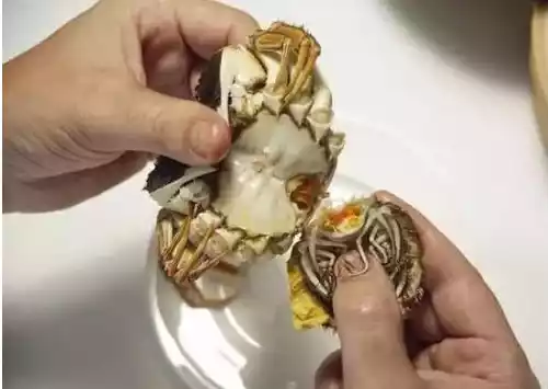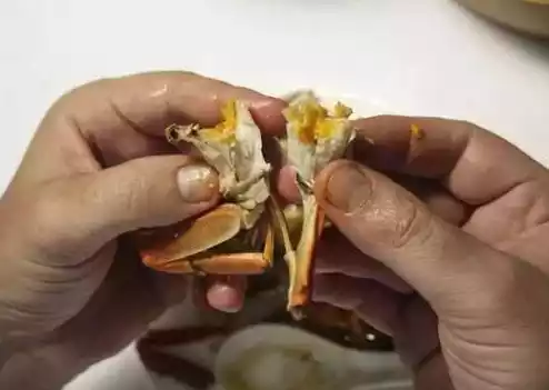 After eating the crab shell, remove the crab gills and split the crab body in two. The crab roe can be broken out and eaten directly, and the remaining delicious crab meat can be enjoyed directly after removing the black part.