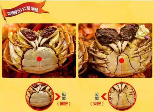A special reminder: Since ancient times, there's been a saying about eating crabs: "Nine females, ten males." In September, female crabs are laden with eggs, their roe plump, and therefore best eaten. In October, female crabs spawn, while male crabs have their gonads fully developed, appearing plump and yellowish-white. Male crabs are best eaten. Distinguishing the sex of crabs is simple: simply turn the crab over and look at its belly button. A triangular shape indicates a male, while a round one indicates a female.