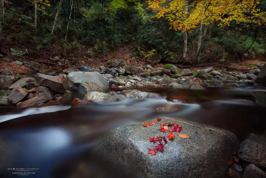 An autumn breeze blew, opening the door to a fairytale world. Fiery red, dazzling gold, and pure dark green greeted us, as if we had entered a vast kingdom of color. Multicolored leaves and emerald waters slowly stretched from the distant foothills to our very eyes. Words could only exclaim in astonishment.