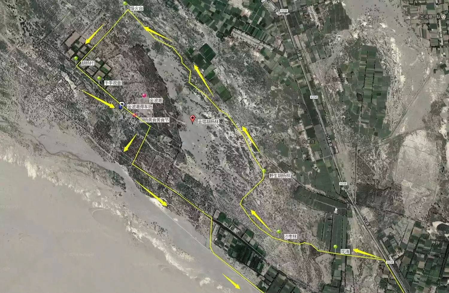 Visitors enter the scenic area and take a sightseeing bus for 20 yuan per person (there are no stops, and ticket holders can ride as many times as they want within the scenic area). The most unmissable attraction is the scenery of Jinbo Lake. The bus tour sequence is shown below. In addition to the Populus euphratica forest, there are also large areas of Elaeagnus angustifolia, white poplar, red willow, and other tree species unique to the Northwest.