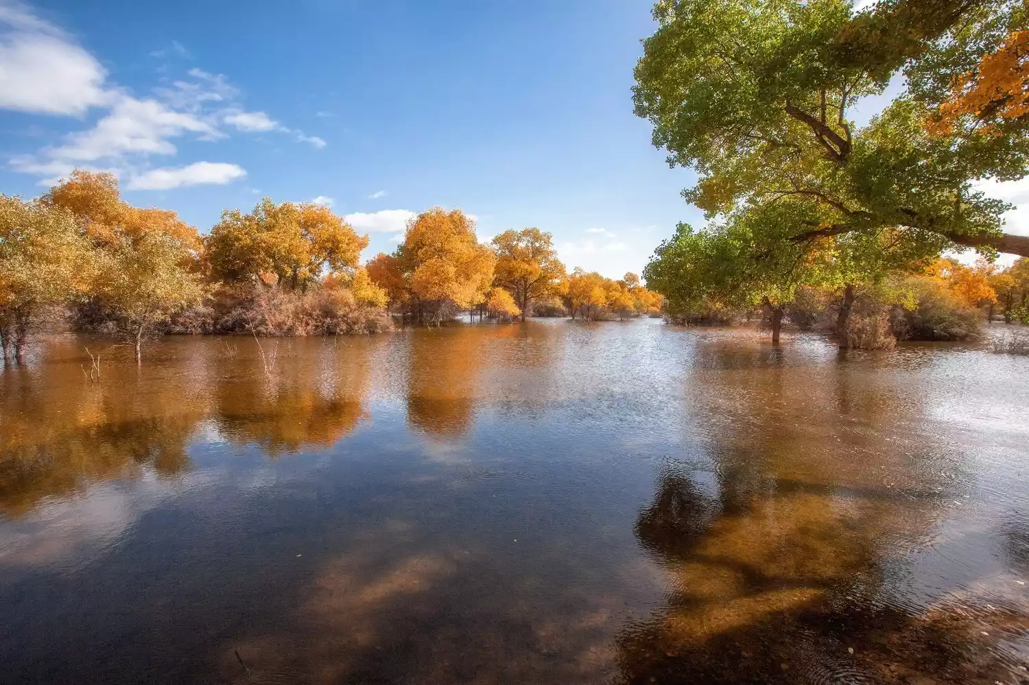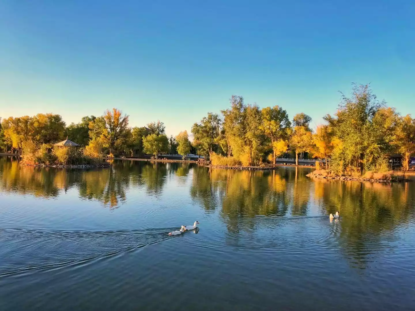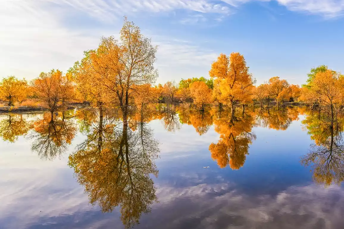 The unique reflection of Jinbo Lake in the Jinta Populus euphratica forest is an iconic landscape unique to Jinta. The poplars are lush and golden, and their reflections in the water are very beautiful, allowing you to fully enjoy the beautiful scenery of the "Jiangnan" in the desert.