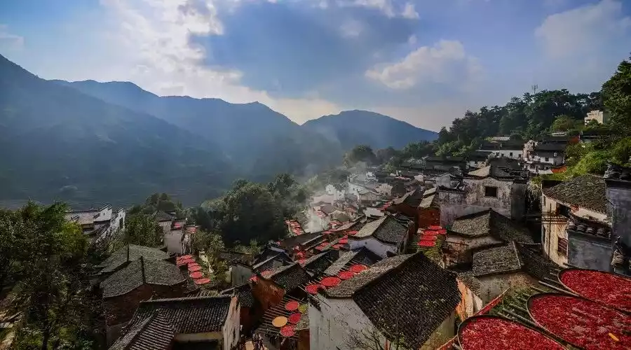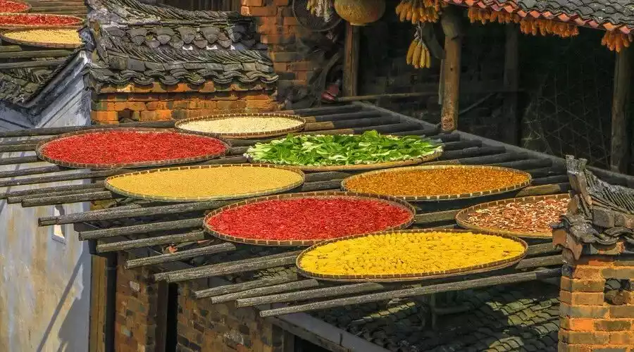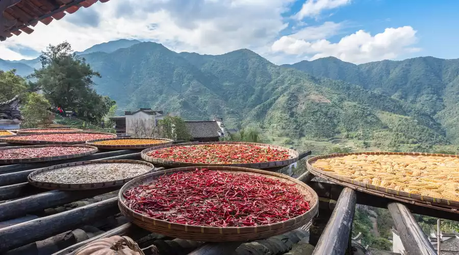 September is harvest season, giving rise to the traditional Wuyuan custom of drying crops. After the harvest, farmers place ripe rice, peppers, fruits, peanuts, and soybeans on their rooftops to dry in the sun, creating a dazzling display of colors. Many people come to Wuyuan in autumn just to witness this spectacular spectacle.