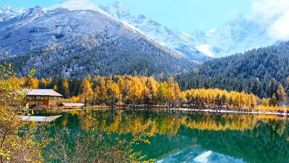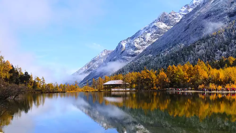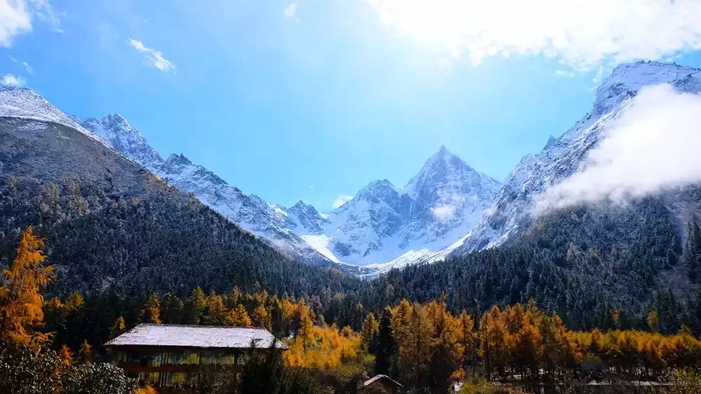 The Siguniang Mountain Scenic Area is located in Siguniang Mountain Town, Xiaojin County, Sichuan Province. It belongs to the Qionglai Mountain Range on the Qinghai-Tibet Plateau and comprises four continuous peaks: Yaoguniang Mountain (Yaomei Peak), Sanguniang Mountain, Erguniang Mountain, and Daguniang Mountain. Yaoguniang Mountain, at 6,250 meters, is the second highest peak in Sichuan Province. These four peaks are perpetually capped with snow. Because Yaomei Peak is the most slender, it is known as the "Queen of the Sichuan Mountains" and the "Eastern Alps." It faces Mount Gongga, the "King of the Sichuan Mountains," in the distance. From mid-October to mid-November, the autumn colors of Siguniang Mountain are breathtaking, but temperatures can be slightly lower, so please dress warmly. In the early morning, mist lingers over the towering redwood cliffs. Sunlight shimmers, creating a shimmering effect, and even the leaves sway in the wind, creating a scene of countless pearls scattered across the canyon. Yaomei Peak stands tall, and at its foot, a locally sourced wooden house, a stream, and a forest create a picturesque paradise.