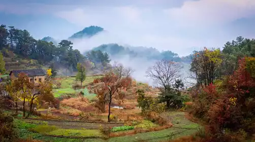 The autumn mornings in the Dabie Mountains are as tranquil as a landscape painting. The mountainside, the stream, the houses, the harvested rice stubble, the faint purple mist on the ridges, the birdsong, the tallow trees on the roadside, the gray brick shrine... all are painted with rich ink and color. Shengrentang Village hangs high against the clear sky. Hundreds of miles of green mountains stretch out, thousands of years of white clouds return, and we plunge into the autumn colors, seeking a place that belongs only to us, to enjoy the beauty this earth has gifted us.