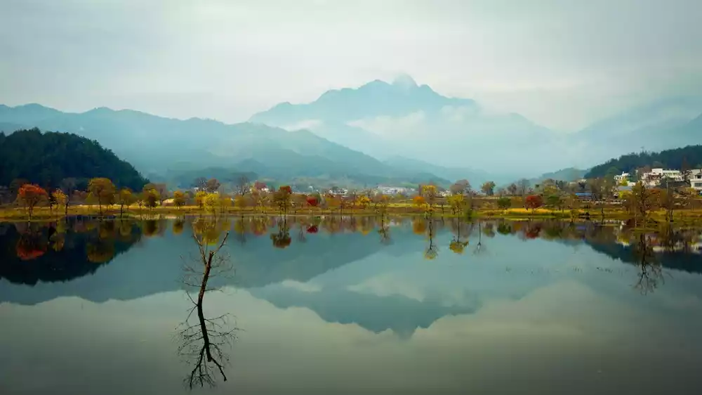 There is also the "magic" in the pond. The colorful leaves are reflected in the water mirror, and combined with the distant mountains and mist, it is like a dream.