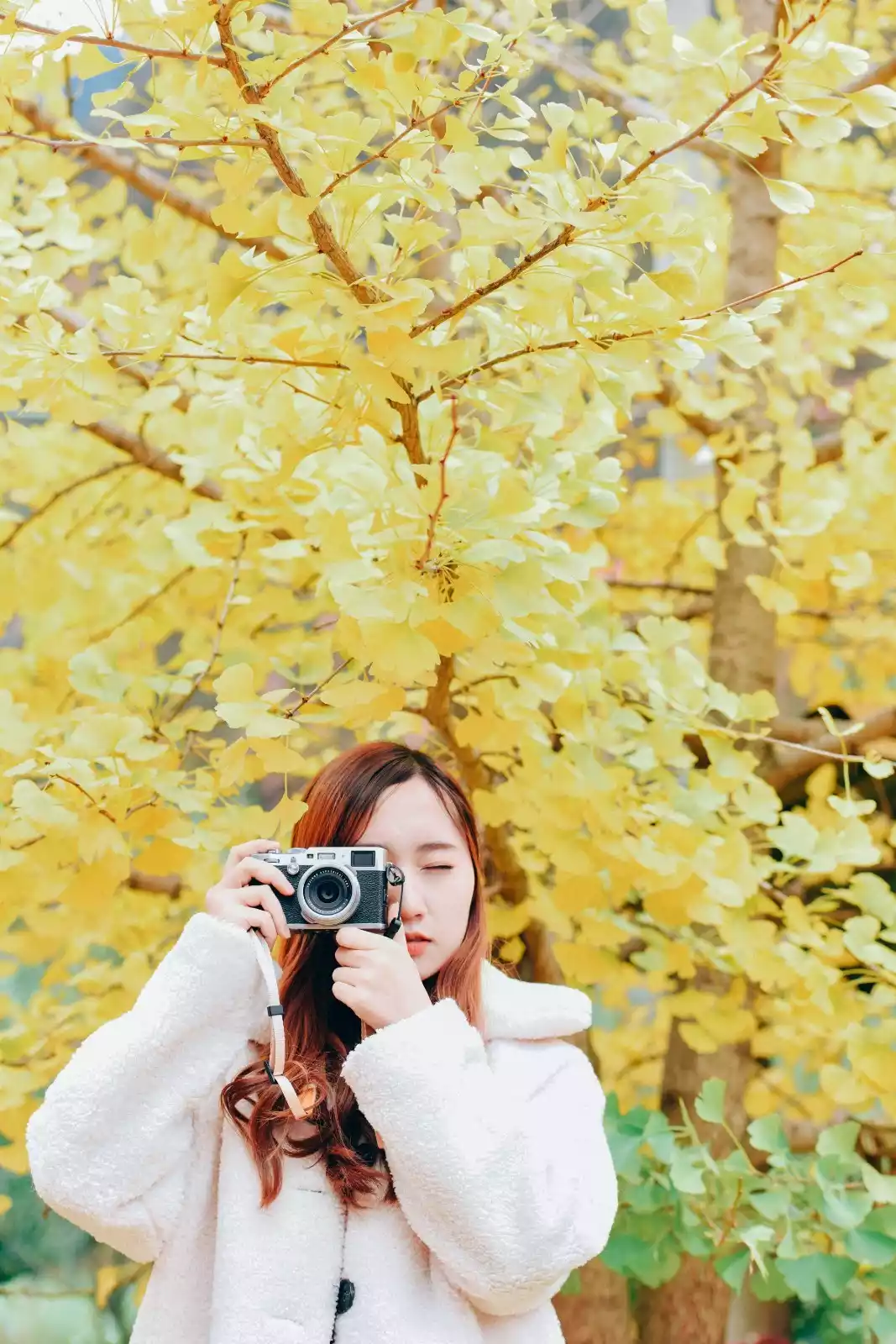 Because the trees are quite tall, you can place a stool under the model's feet, but be careful. You can also pick up some fallen ginkgo leaves and scatter them in the air. Using a wide aperture and a fast shutter speed will create a very dynamic photo.