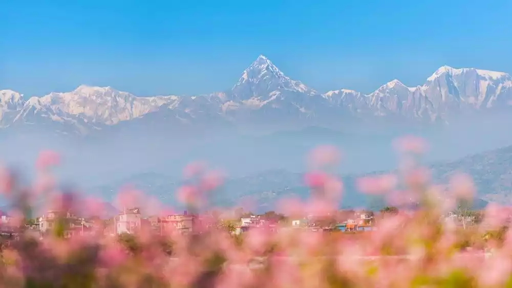 Then the cherry blossoms begin to fly. If you're afraid of the crowds in Japan, then Pokhara in Nepal is the perfect choice. The Japanese loved Pokhara so much that they planted many cherry blossoms here. During the cherry blossom season, especially when you walk into the Annapurna Mountains, wild cherry blossom petals fall all over the mountain paths, creating a poetic and picturesque scene, like entering a fairy tale world!