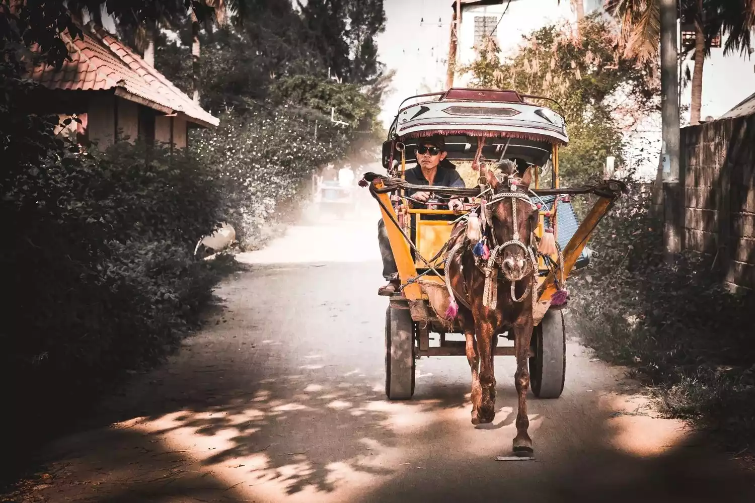 In addition to bicycles, you can also see many horse-drawn carriages shuttling through the alleys, with the horses wearing some local Indonesian accessories.