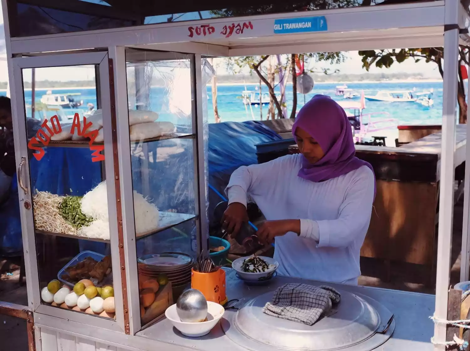 There is a food stall on the beach. It starts to get lively around 6pm every day, and the smell of barbecue will fill the streets and alleys of Gili T Island.