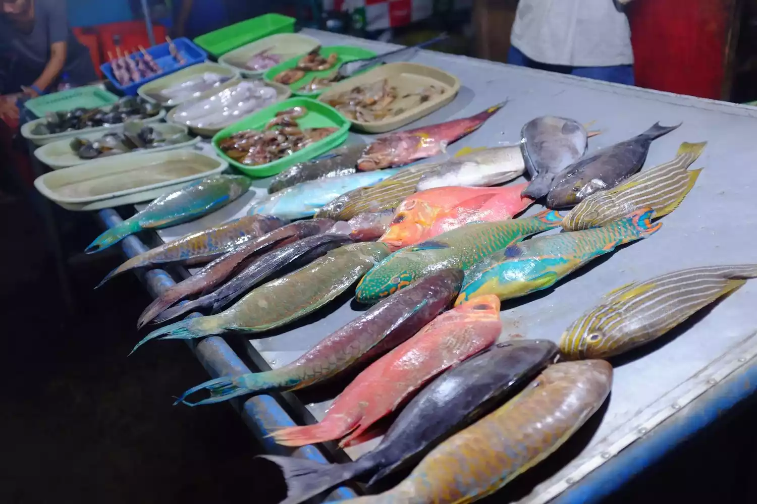 Due to religious restrictions, you won't find pork products like bacon and sausage on the island. Most of the island is grill & bar. Every evening around 5pm, the beachfront restaurants open, and waiters place freshly caught seafood on the tables for sale, offering a wide variety of fish, shrimp, and crab. Each grilled fish comes with a salad, rice, or potatoes—not fries, but whole potatoes! The meal costs around 50 per person, though if you order lobster or tiger prawns, it's a different story. One complaint: no matter what kind of fish is grilled, it tastes the same. Every time I eat, I long for China.