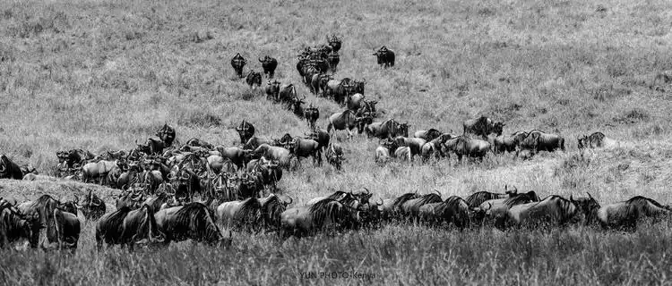 The protagonists of the African animal migration: wildebeest. They are ugly, with disproportionate bodies, large horns, heavy heads, dark faces, and long hair on their necks but not on their bodies.