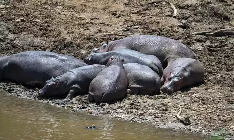 We then drove straight to the Mara River. The first thing we saw was a hippopotamus, or simply hippo. Hippos spend their days in the water, coming up to the shore at night to graze. They're said to be able to walk over ten kilometers. In fact, hippos are the animal responsible for the most injuries to people each year, so it's important to keep a safe distance from them!