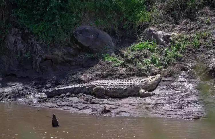 There are many Nile crocodiles lying in the Mara River. They are very large, and the largest ones are estimated to be about 4 meters long. When the wildebeest migrate, they lie in the water waiting for a feast, which is a bit scary when you look at them up close.