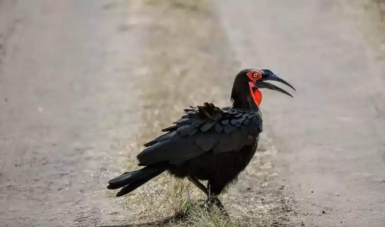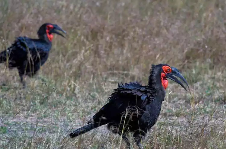 This is a ground hornbill. It's easy to spot, with a red face, a patch of red flesh on its chin, and the characteristically large, blade-like beak of a hornbill. Just because it's called a ground hornbill doesn't mean it can't fly. James says they can fly, but few people have seen them. This bird can be seen near Lake Nakuru and in the Masai Mara.