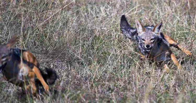 This guy likes to steal cheetahs' food, no wonder they don't welcome him. This jackal is easy to spot, with black markings on its back that clearly separate it from its body. I saw them playing and fighting.