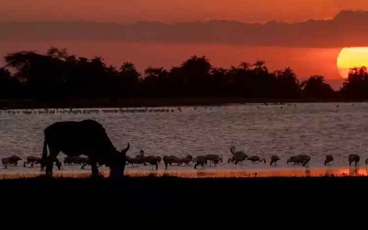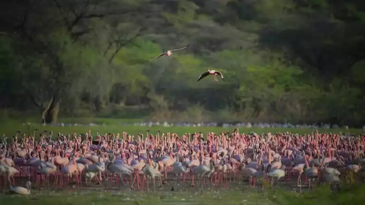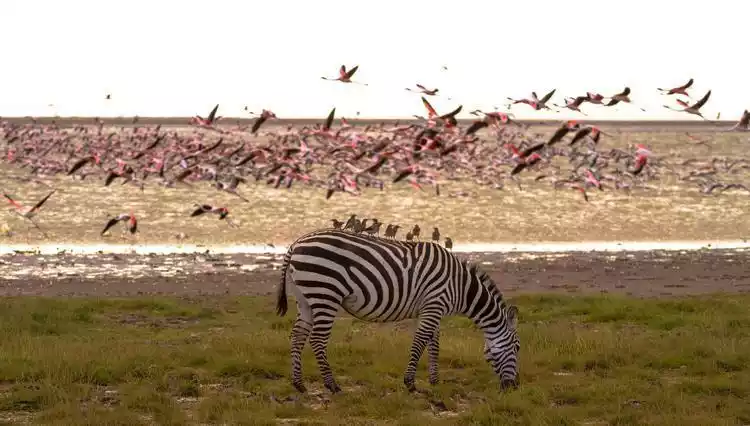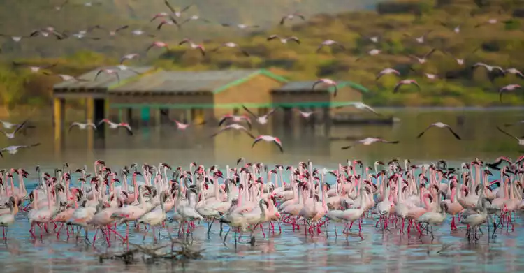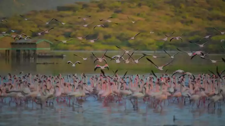 Flamingos thrive in hot climates, and equatorial Kenya is their ideal habitat. At Lake Bogoria, Lake Nakuru, and Amboseli National Park, you can witness flocks of flamingos performing their "never-ending flamingo dance."