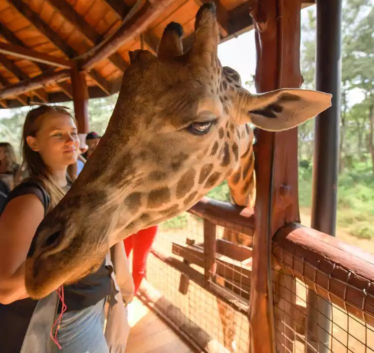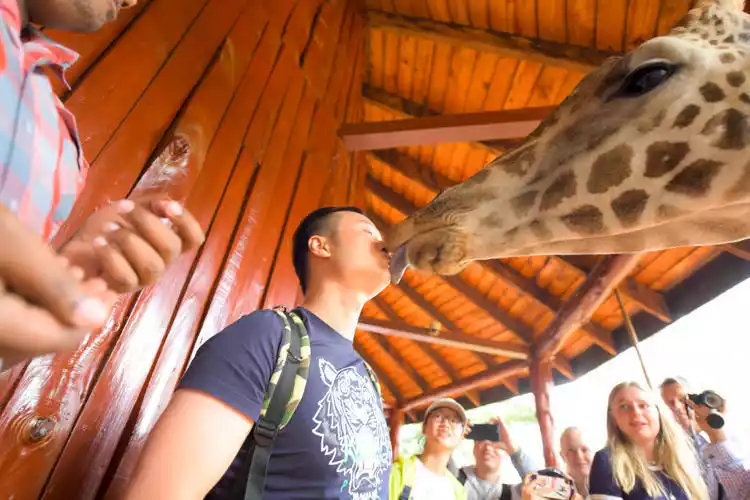 The Giraffe Center, a giraffe park established by the African Wildlife Foundation to protect wildlife and the environment, offers free access to feed the giraffes. Their tongues are dark blue and at least 20cm long. Giraffes are completely fearless, and you can even go up to the rooftop for a close encounter with them!