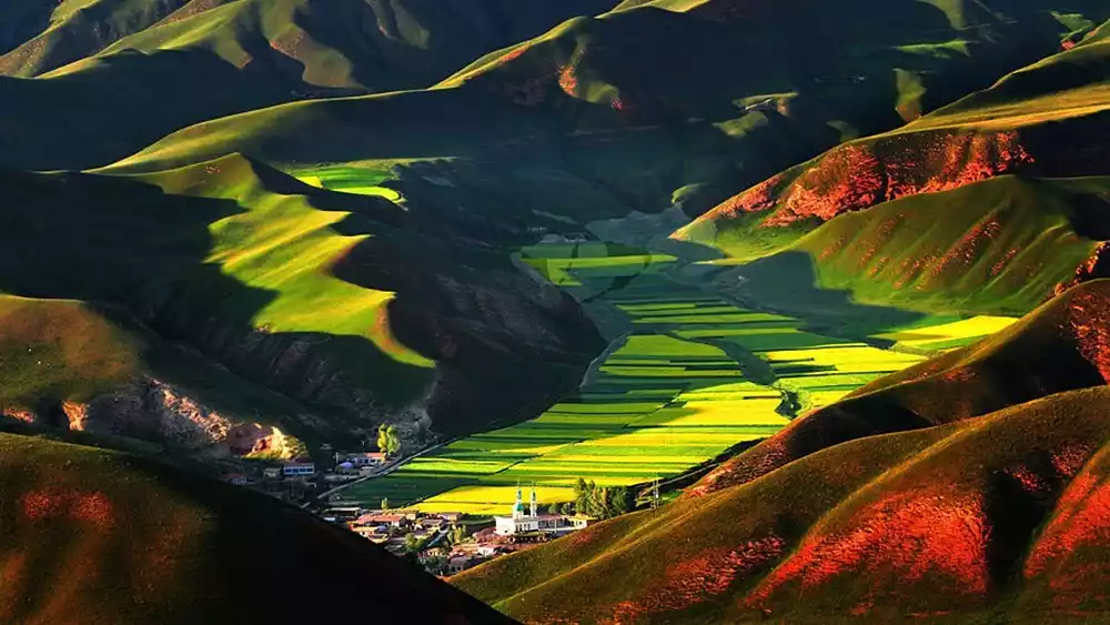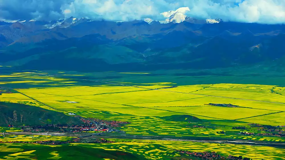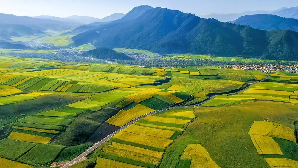 Some people think rapeseed flowers are everywhere, but when you visit Menyuan, it's not the flowers themselves you're looking at, but the sheer awe of seeing thousands of acres of rapeseed flowers blanketing the landscape in golden glory. Standing on a commanding vantage point, overlooking the boundless sea of rapeseed flowers, with the towering Qilian Mountains in the background, lush green barley fields, ancient mosques, and scattered villages, the scene is breathtakingly beautiful.