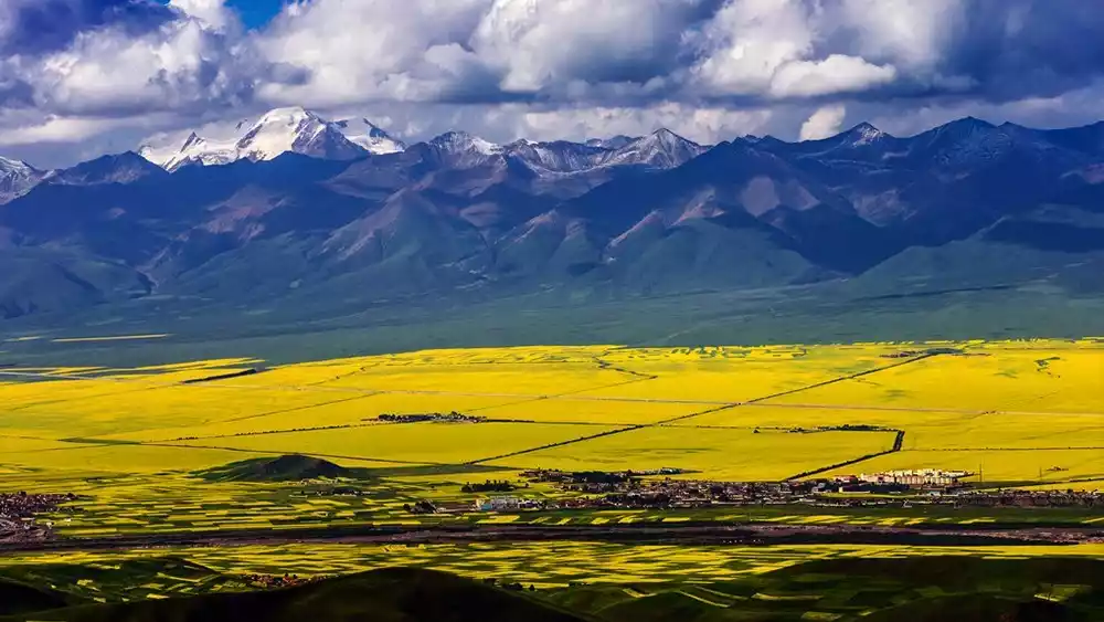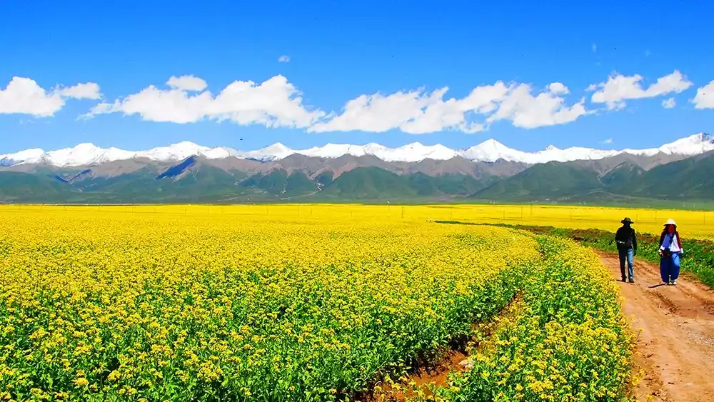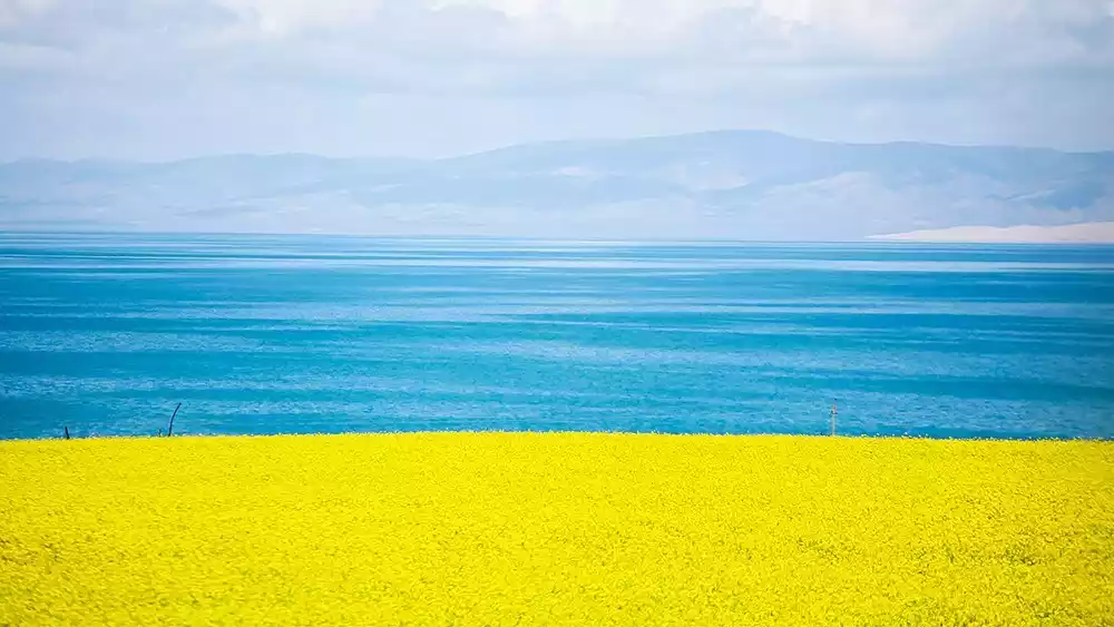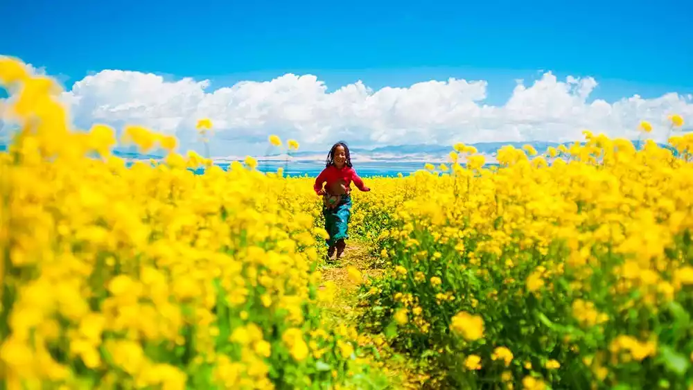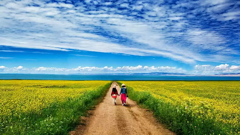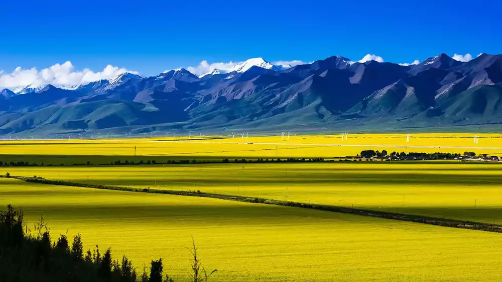 Imagine the perfect combination of blue sky, white clouds, snow-capped mountains, azure lake, and rape blossoms. This is the magnificent sight you'll encounter at Qinghai Lake during rape blossom season.