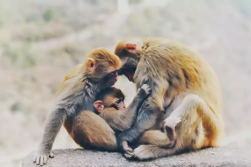 Going up the mountain from Chijia Tower, you will pass the monkey sanctuary where a group of cute macaques live. They are not afraid of people.
