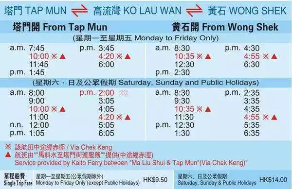 Departing from Huangshi Pier: HK$9.5 on weekdays, HK$14 on weekends (one-way)