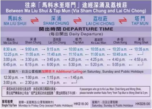 There are fewer sailings at Ma Liu Shui, but there is a subway station near Ma Liu Shui Wharf, making it convenient to travel to and from the city. The earliest departure is at 8:30 am, and there is another at 3:00 pm. On holidays, there is an additional departure at 12:30 pm. The return trip is at 11:10 am and 5:30 pm, with an additional departure at 1:45 pm on holidays.