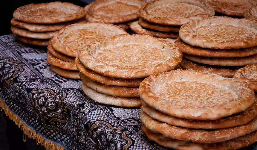 A staple food for Xinjiang residents, naan is a baked flatbread similar to a sesame seed cake, which can be crispy or soft, with a pleasant aroma. Most are round and come in a variety of shapes, sizes, and flavors. Naan is typically made from wheat flour, though cornmeal is also used, and is baked with sesame seeds, onions, eggs, cooking oil, ghee, milk, salt, and sugar.