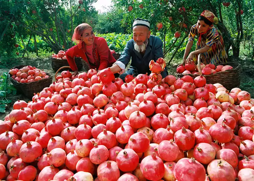 Yecheng County, known as the "Hometown of Pomegranates," is particularly famous for its pomegranates. Located at the northern foot of the Kunlun Mountains, Yecheng County boasts a short frost season, long sunshine hours, a large temperature swing between day and night, and excellent soil, making it ideal for pomegranate growth. Its reddish color and sweet juice are highly sought after. Fresh pomegranate juice can be found on the streets of Xinjiang, offering a unique flavor worth trying.