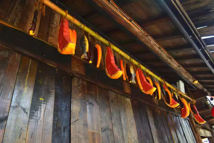 This is a truly bizarre street full of interesting things. The eaves of the houses on this street are covered with all kinds of "meat" hanging from them.