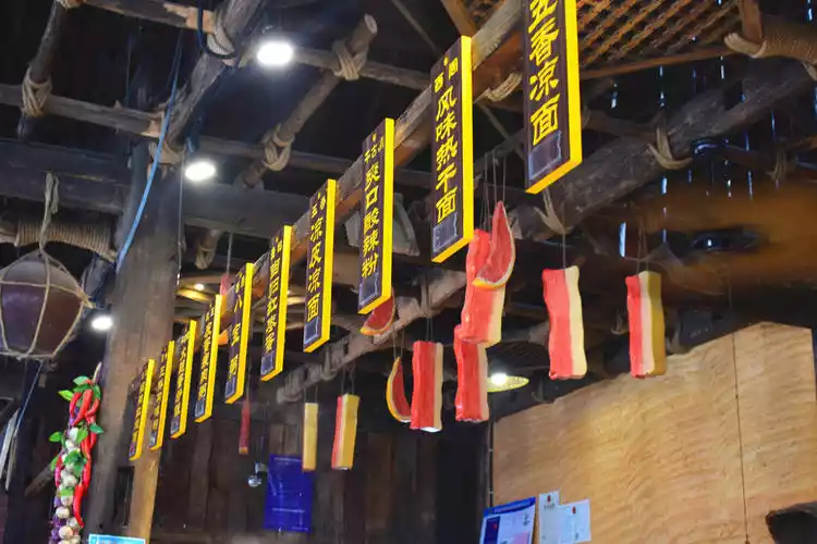 The layout of the snack square is also unique, with plaques with the names of dishes hung on the beams, and meat and various ingredients hanging on the walls.