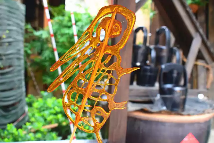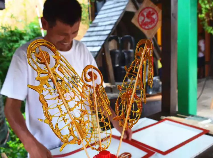 There are also sugar-coated cakes, hand-drawn sugar threads, and sugar figures in various animal shapes painted by the master.