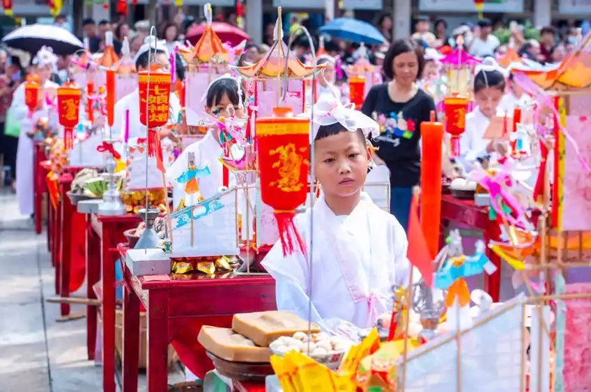The Little People's Festival is equivalent to the coming-of-age ceremony for children in fishing families. On the seventh day of the seventh lunar month, residents set up an altar at their doorsteps, with a colorful pavilion or bridge specially made for the child on it, offering sacrifices to the Seventh Lady and praying for the child's smooth growth.