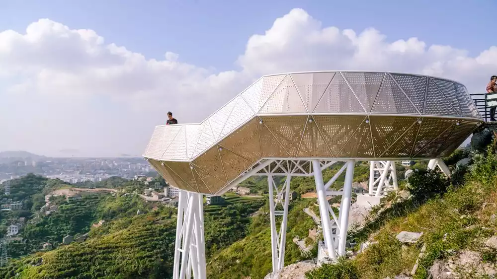 Each platform is 1.5 meters wide, with a circular diameter of 10.55 meters. The slightly uneven design and circular viewing platform allow us to have a 360-degree panoramic view of the stone pond.