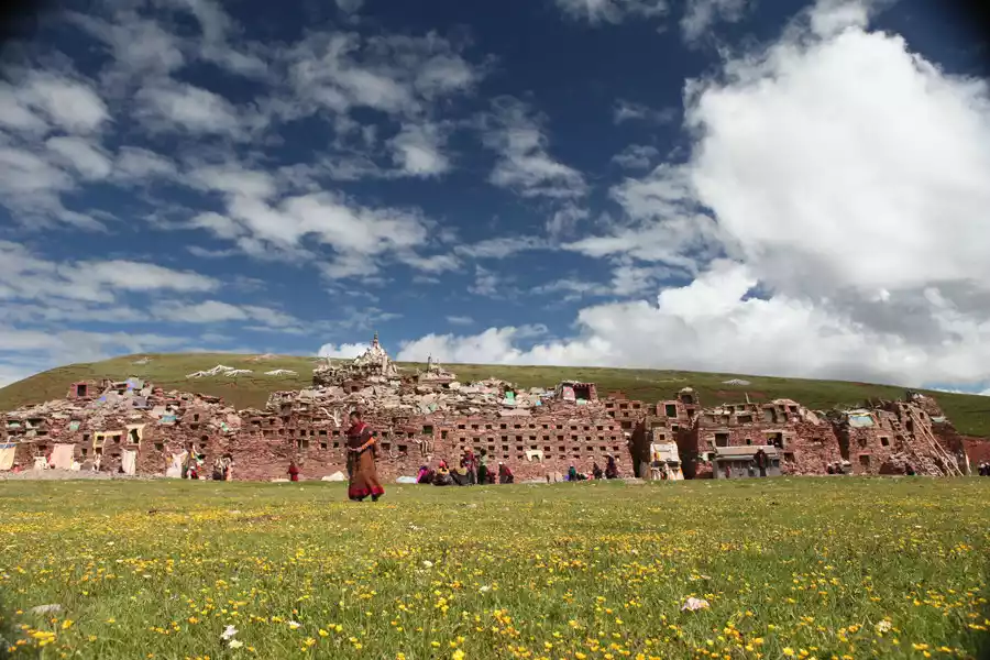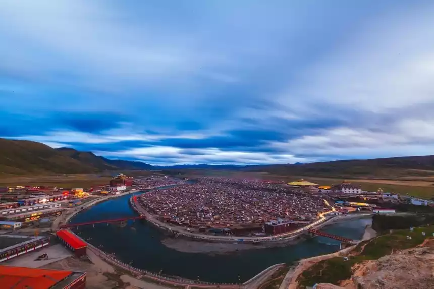 Yachen Gar is divided into two districts, the Drakpa and the Jyumu, separated by the Changtai River. The temple's main scripture hall, the "Perfect Light Hall," is modeled after the renowned "Utse Hall," the main hall of Samye Monastery. Its imposing exterior features 160 pillars. Currently, there are approximately 10,000 Jyumu (nuns) and another 10,000 Drakpa (nuns), along with lay Buddhists and their families, for a total population of nearly 30,000, nearly equal to the entire population of Baiyu County.