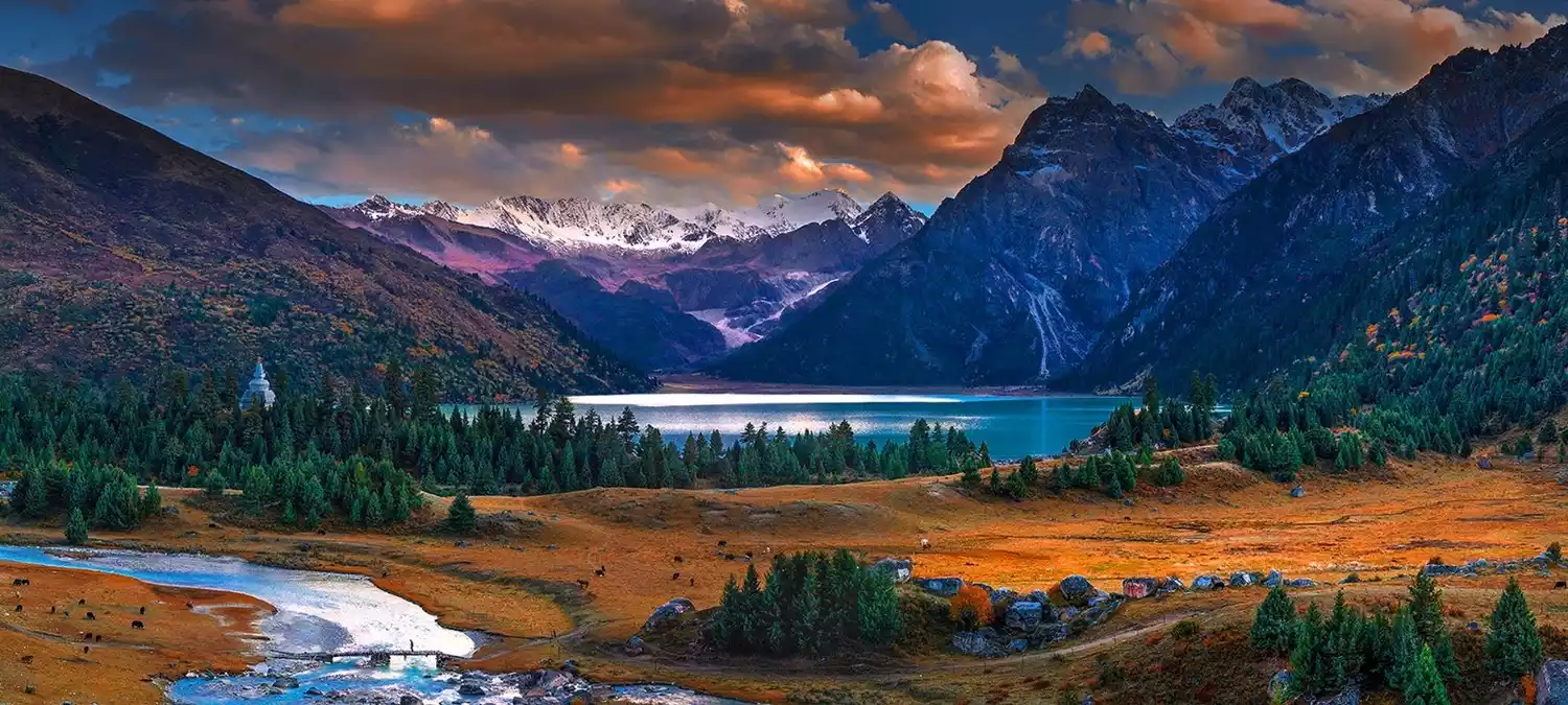 The beauty of the Seven Lakes of Bam varies greatly depending on the light of the day, sometimes serene and sometimes brilliant. Lakes, waterfalls, primeval forests, meadows, snow-capped mountains, relics of the ancient Tea-Horse Road, temples, and Tibetan villages all combine to create a rare spectacle.