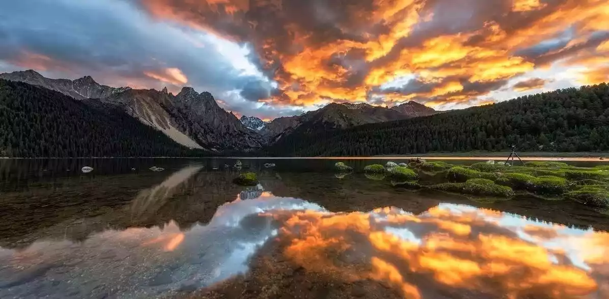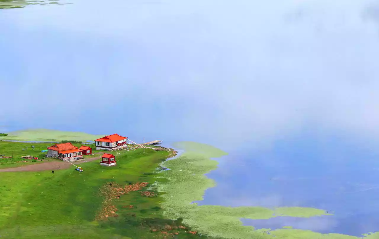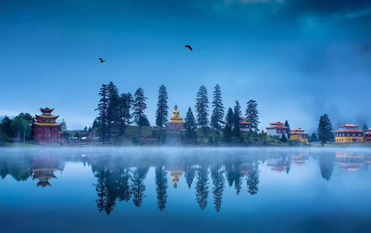 As you approach Cokha Lake, you'll be struck by its crystal-clear water, the beauty of a mirrored world where heaven and earth merge. This is especially true during misty rainstorms, when thick fog lingers on the lake's surface, like a mysterious figure shrouded in a veil, framing the surroundings with an extraordinary solemnity. At this moment, the world outside the lake becomes indistinguishable from the real world within. Heaven and earth, mountain and lake, blend seamlessly into a magical fairyland. For a moment, you might even mistake the reflection in the water for the real world. Temples, plateau lakes, pristine forests, Tibetan dwellings, distant views of snow-capped mountains, Buddha statues, pagodas, wind horse flags, prayer wheels, fish, Tibetan dogs, and birds in the lake, the kindhearted Tibetan people, and the devout monks—all these are part of Cokha Lake's unique landscape.