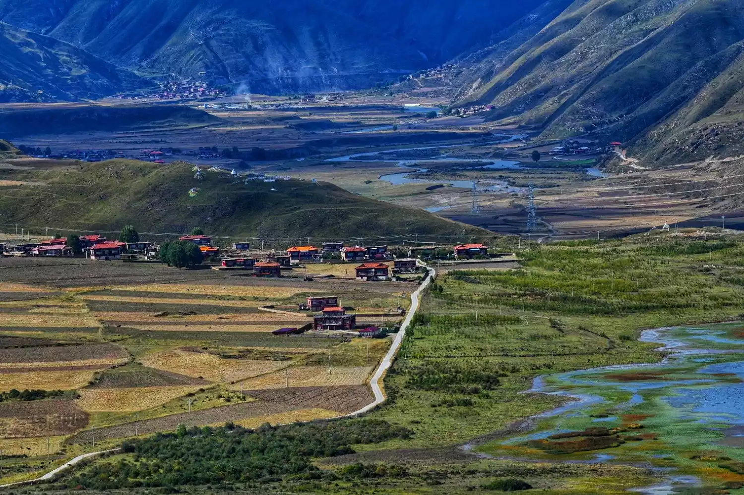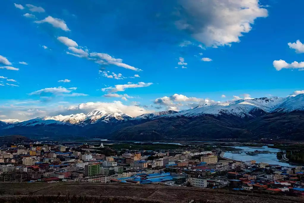 Panoramic view of Ganzi, with the Kawaluor Snow Mountain in the distance and the Yalong River on the right
