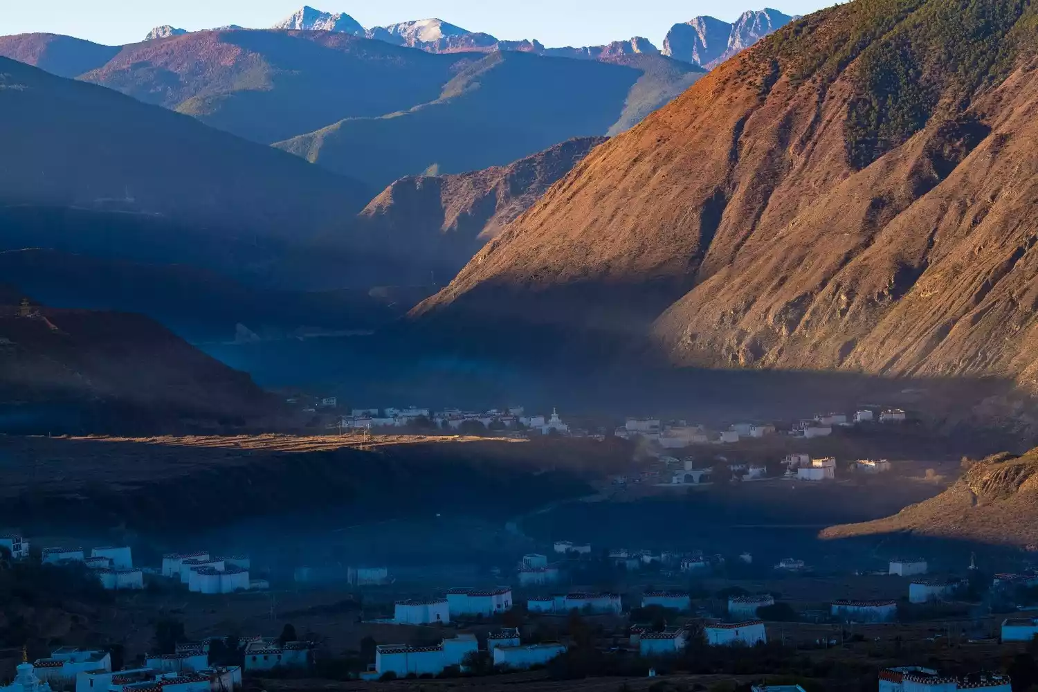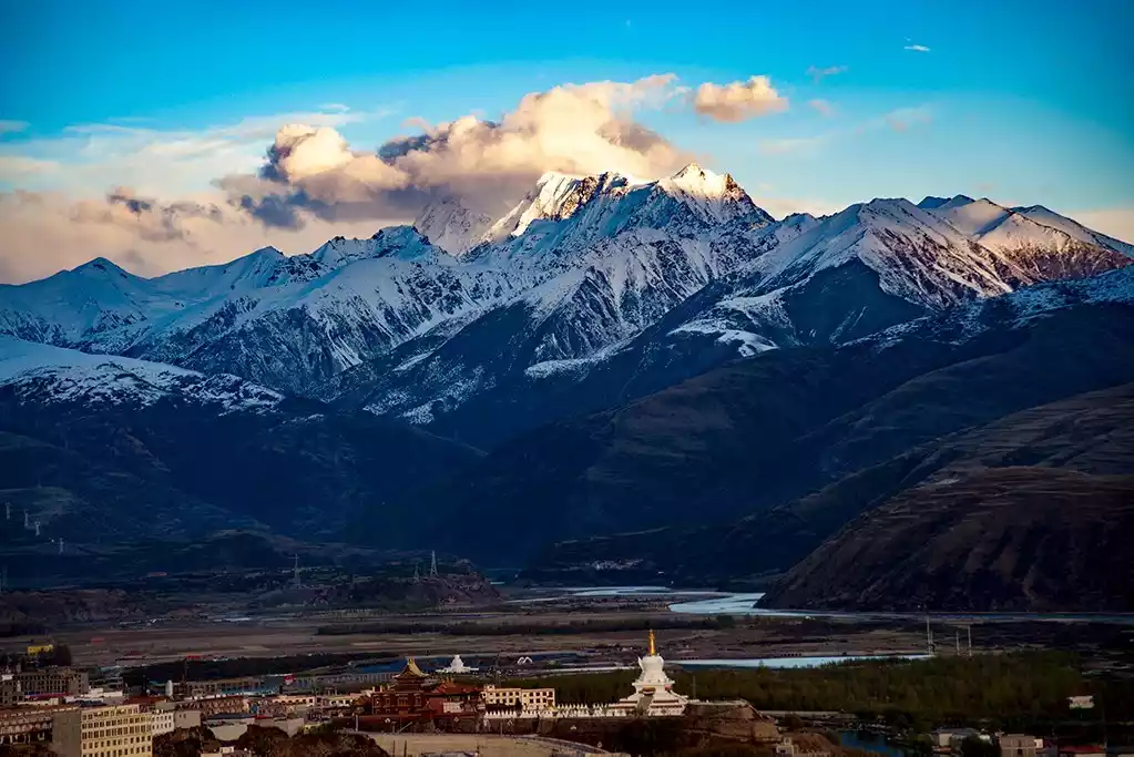 The setting sun frames Garze Monastery, the Yalong River Valley, and the sacred Mount Kavaluozhi, creating a sacred scene. Towering snow-capped mountains, a tranquil river, and golden sunlight bathe the valley. Garze Monastery and the Great Liberation Pagoda in front of it offer the perfect vantage point for photographing Garze County, the Yalong River Valley, and the sacred Mount Kavaluozhi.