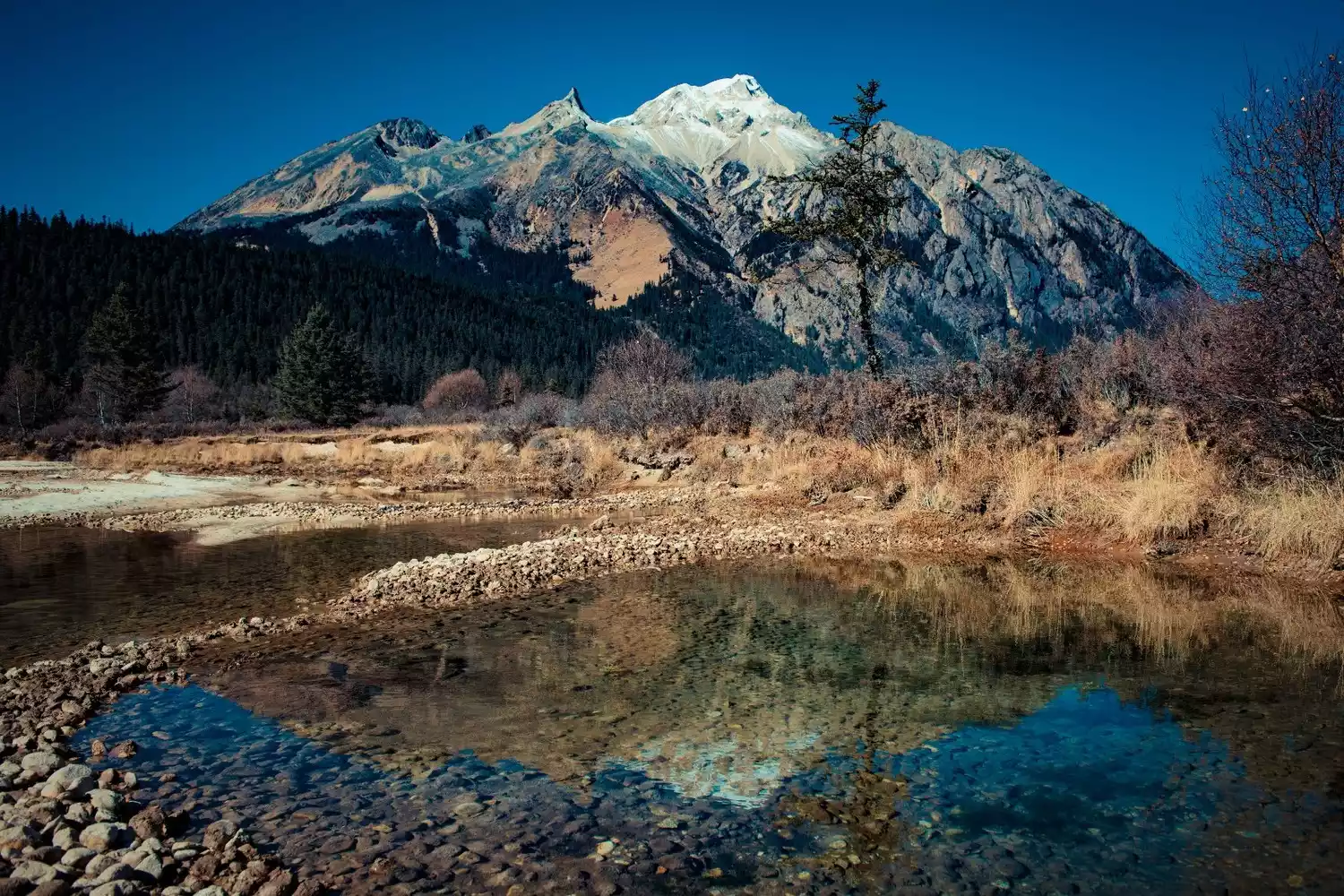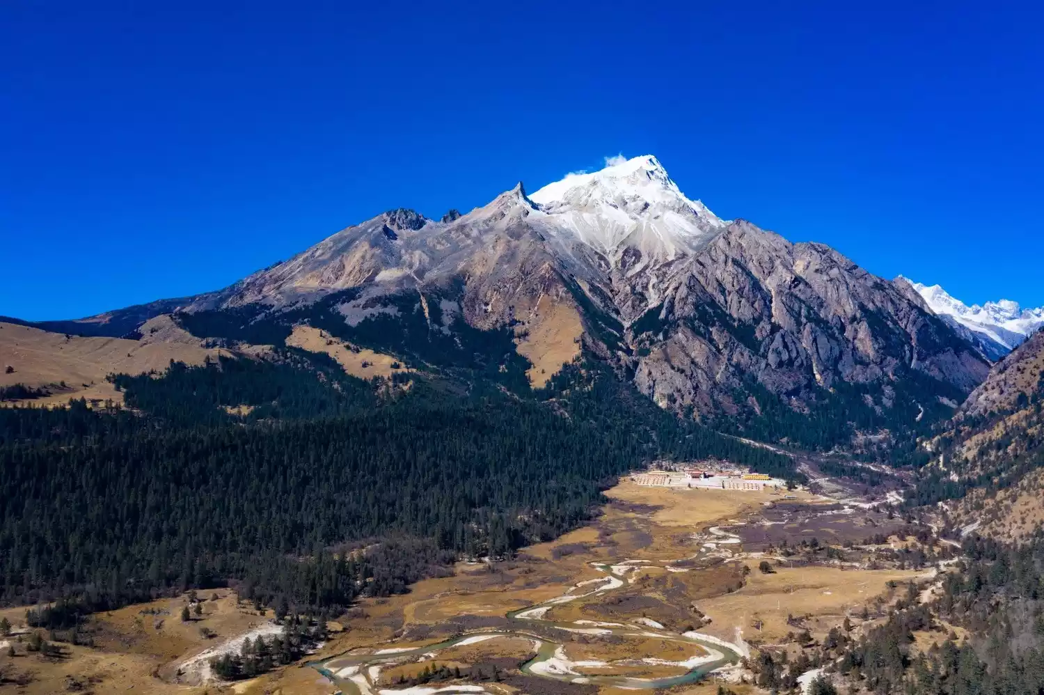 The Three Sacred Mountains are the highest peaks in the southern section of the Sharuli Mountains, forming a triangular formation. The northern peak, Xiannairi, reaches 6,032 meters, the southern peak, Yangmaiyong, 5,958 meters, and the eastern peak, Xialangduoji, 5,958 meters. Each peak has a distinct shape, yet all are pristinely white and spotless. A vast forest cascades through the mountainside, punctuated by cascading waterfalls. At the foot of the mountain, a wide valley meanders, punctuated by a mirror-like lake. This organic combination of snow-capped peaks, glaciers, forests, streams, waterfalls, meadows, and lakes, where wildlife roams, creates a tranquil haven.